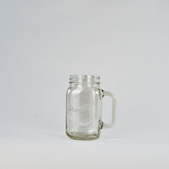 Tarro de vidrio con capacidad de 16 OZ. Útil para contener bebidas.