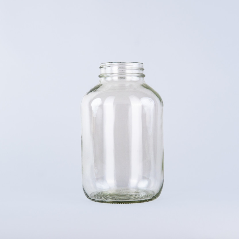 Tarro de vidrio con capacidad de 1/2 galón.